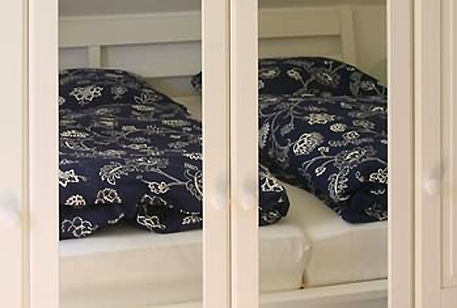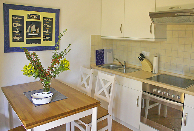 Weiße Möbel und die Farbe blau prägen die Wohnung in der Ferienresidenz "Dünenidyll". Das Gebäude liegt zurückgesetzt und eingebettet in eine kieferbewachsene Düne.